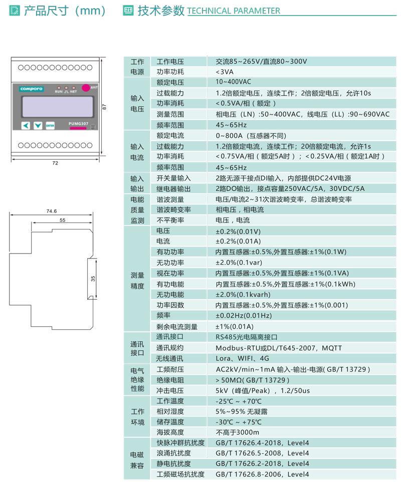 PUMG307系列三相導(dǎo)軌式智能電力能效終端采用DIN35mm 導(dǎo)軌式安裝結(jié)構(gòu)和LCD液晶屏顯示,集三相電參量測量、2~31次諧波分析、時間統(tǒng)計等于一體,標配1路RS485通訊接口,可通過Modbus-RTU或DL/T645-2007通訊協(xié)議實現(xiàn)儀表的網(wǎng)絡(luò)化管理。還可擴展2路開關(guān)量輸入 和2路 繼 電 器 輸 出 , 可 外 接 開 口 式 互 感 器 易 于 改 造 項 目 的 施 工 。PUMG307具有體積小巧,精度高,可靠性好,安裝方便等優(yōu)點,多用于系統(tǒng)集成、改造工程、安裝空間有限或不便的項目。