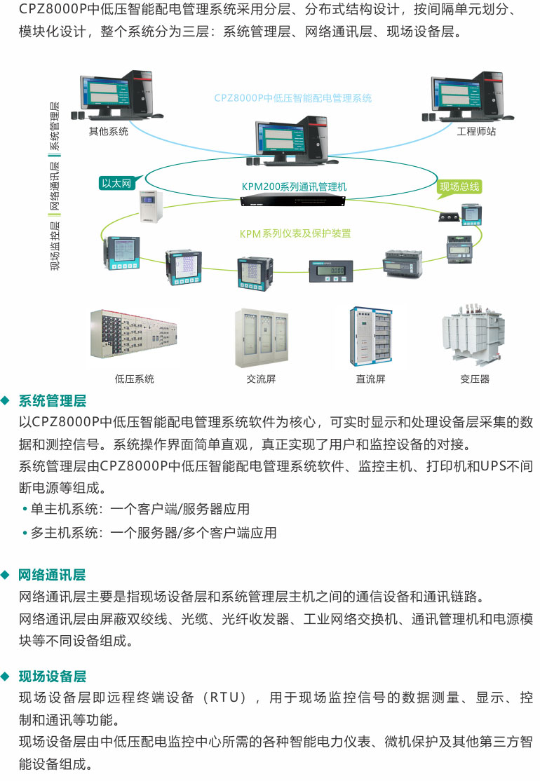 CPZ8000P中低壓智能配電管理系統(tǒng)采用分層、分布式結構設計,按間隔單元劃分、模塊化設計,整個系統(tǒng)分為三層:系統(tǒng)管理層、網(wǎng)絡通訊層、現(xiàn)場設備層。