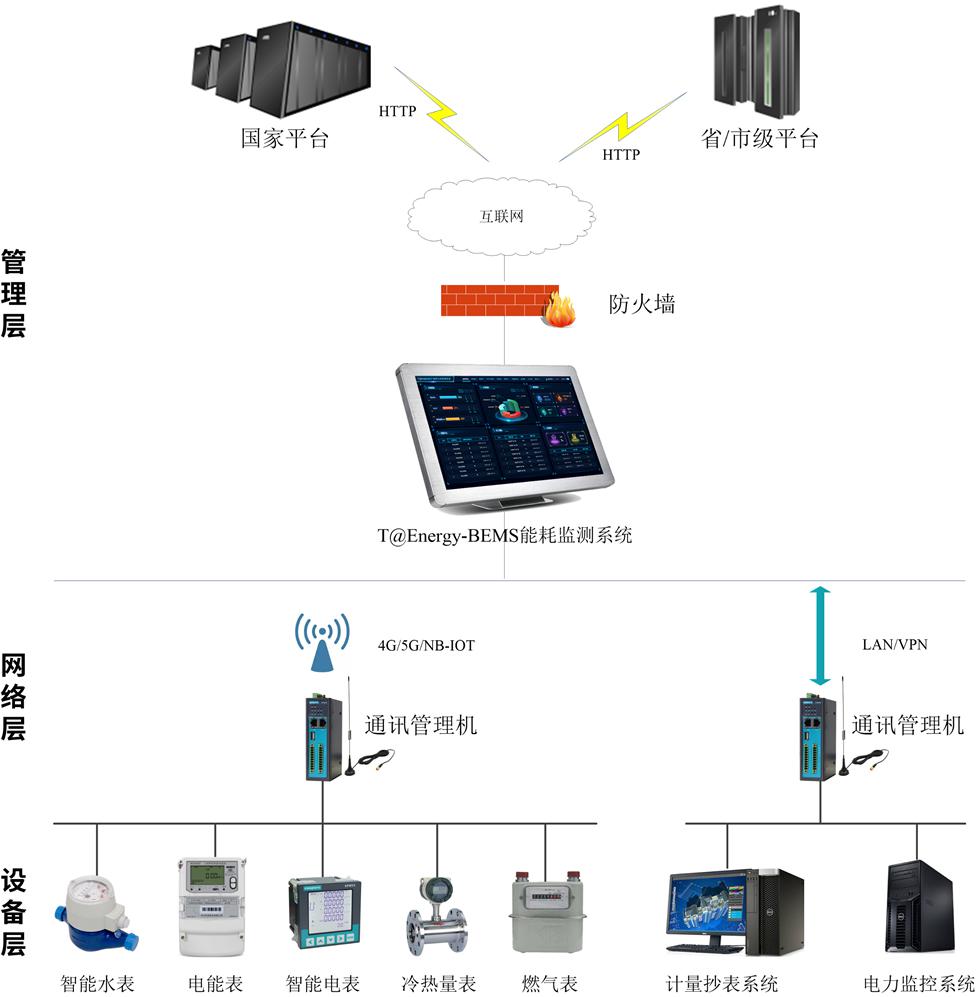 管理層:從網(wǎng)絡(luò)上可分為內(nèi)網(wǎng)和外網(wǎng)兩部分。內(nèi)網(wǎng)部分用于接收下屬通訊管理機(jī)上傳的基礎(chǔ)能耗數(shù)據(jù),并將基礎(chǔ)能耗數(shù)據(jù)進(jìn)行處理、存儲(chǔ)、分析、展示給能源管理人員,能耗管理工作站用于查看能耗管理服務(wù)器分析后的能耗數(shù)據(jù),并對(duì)數(shù)據(jù)和信息進(jìn)行基礎(chǔ)管理。外網(wǎng)部分主要是建筑的能耗數(shù)據(jù)進(jìn)行匯總、整理、打包、加密后通過互聯(lián)網(wǎng)將數(shù)據(jù)上報(bào)至上一級(jí)能耗管理平臺(tái)。