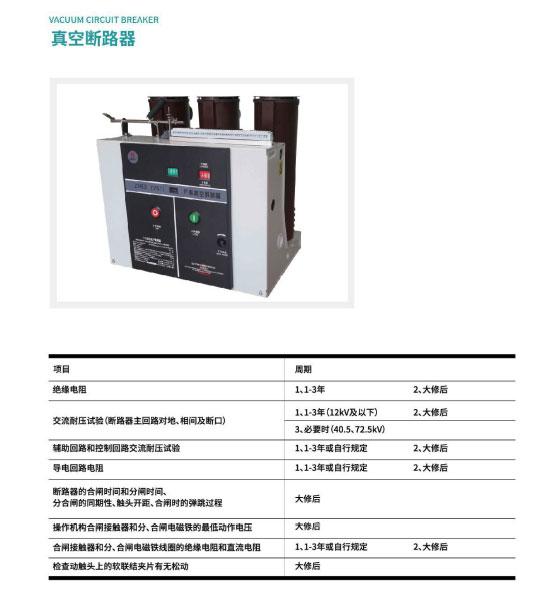 根據DL/T 596-2005《電力設備預防性試驗規(guī)程》要求,電氣設備需按照規(guī)范要求定期做預防性試驗及完成相應試驗項目,其中變壓器、電力電纜、真空斷路器和開關柜等主要的配電室內電氣設備的常規(guī)試驗項及周期如下所示。