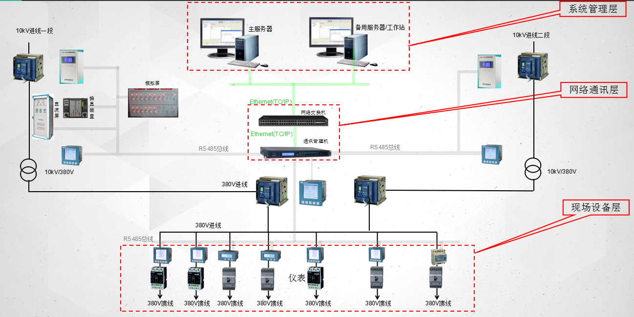 康派智能的電能管理系統(tǒng)主要應(yīng)用于35kV及其以下電壓等級的變配電室。電網(wǎng)中對電壓等級的分類:中壓是指35kV 、10kV、低壓是指660V、380V。在電能管理系統(tǒng)中,系統(tǒng)根據(jù)功能與結(jié)構(gòu)可劃分為三層,分別是系統(tǒng)管理層、網(wǎng)絡(luò)通訊層、現(xiàn)場設(shè)備層。