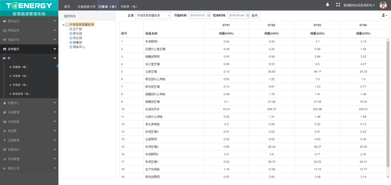 電能分析:能耗分析包括企業(yè)用能分析、部門綜合能耗、設(shè)備用能分析和電量指標(biāo)綜合分析這四類,將企業(yè)中各部門及各監(jiān)測點(diǎn)實(shí)際用能情況,通過不同的分析方式展現(xiàn)出來。