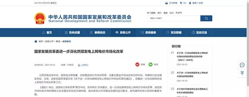 2021年10月11日,國家發(fā)展改革委發(fā)布《國家發(fā)展改革委關(guān)于進一步深化燃煤發(fā)電上網(wǎng)電價市場化改革的通知》,主要內(nèi)容涉及四個方面: (一)有序放開全部燃煤發(fā)電電量上網(wǎng)電價。(二)擴大市場交易電價上下浮動范圍。(三)推動工商業(yè)用戶都進入市場。(四)保持居民、農(nóng)業(yè)用電價格穩(wěn)定。