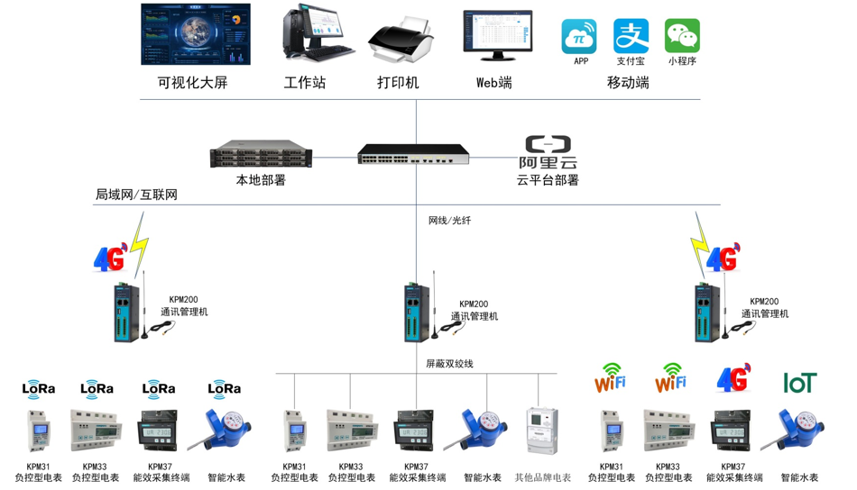 現(xiàn)場采用RS485、以太網(wǎng)GPRS、4G、NB-ot.lora、 Zigbeeifi等傳輸方式,將區(qū)域內(nèi)的電力采集模塊連接至相對的通訊管理機;各通訊管理機通過用戶局域網(wǎng)連接至中央服務(wù)器。