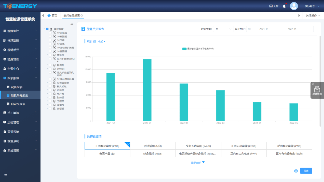 - 展示能耗單元的統(tǒng)計(jì)數(shù)據(jù)、經(jīng)濟(jì)數(shù)據(jù)、運(yùn)行數(shù)據(jù)、能耗排名、負(fù)荷分析、能效分析、力調(diào)分析、分時(shí)分析、變損分析、容需分析、碳排放分析等;