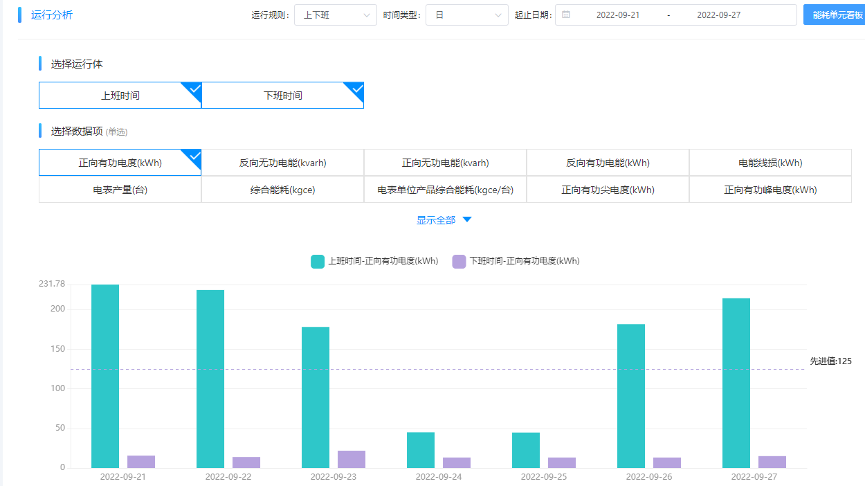 觀察數(shù)據(jù)變化。在“能耗單元-運(yùn)行分析”模塊選擇日數(shù)據(jù)觀察近一周數(shù)據(jù)變化: