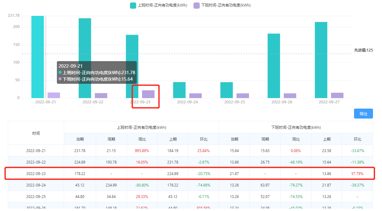 找到異常點(diǎn)??梢酝ㄟ^(guò)柱狀圖和圖表,發(fā)現(xiàn)9月23日的下班時(shí)間能耗要大于一周的平均能耗: