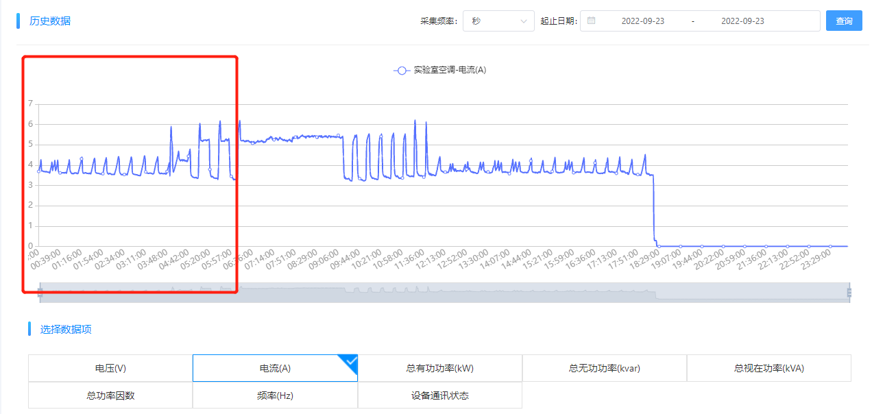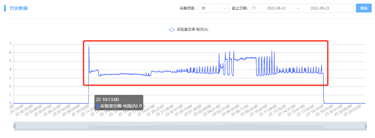 異常用能確認(rèn)。根據(jù)“能源監(jiān)控—歷史數(shù)據(jù)分析”來(lái)進(jìn)一步確認(rèn)異常點(diǎn)的異常數(shù)據(jù),9月23日的用能異常確實(shí)是“嵌入式組-實(shí)驗(yàn)室-空調(diào)”設(shè)備未關(guān)機(jī)造成的。拉取9月22日至9月23日數(shù)據(jù),發(fā)現(xiàn),該嵌入式研發(fā)實(shí)驗(yàn)室的空調(diào)在9月22日上午10點(diǎn)開(kāi)機(jī)后,至次日9月23日下午17點(diǎn)35分左右關(guān)機(jī),9月22日未關(guān)機(jī)。