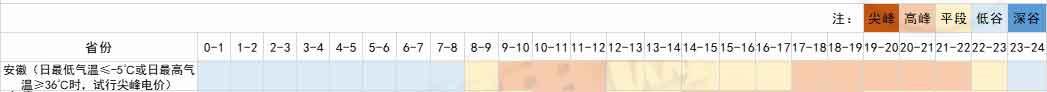 2、安徽省一般工商業(yè)及大工業(yè)用戶(hù)分時(shí)電價(jià)對(duì)應(yīng)的尖峰平谷時(shí)段分布