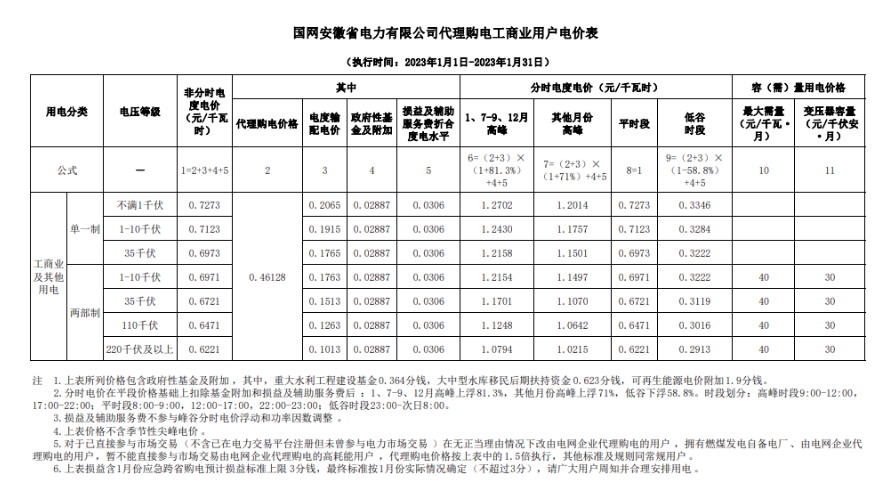 安徽省工商業(yè)用戶(hù)電價(jià)及尖峰平谷時(shí)段劃分段