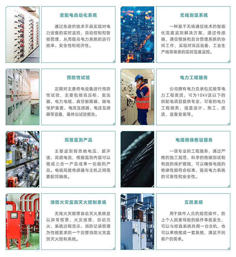 電力綜合服務(wù)聚焦電力系統(tǒng)全生命周期保障:以變配電自動(dòng)化系統(tǒng)提升設(shè)備運(yùn)維效能,通過無線測溫、局放監(jiān)測產(chǎn)品精準(zhǔn)掌握設(shè)備狀態(tài),輔以核心設(shè)備預(yù)防性試驗(yàn)提前規(guī)避故障,同時(shí)提供電力全鏈條工程服務(wù),并配套電纜絕緣敷設(shè)、消防火監(jiān)監(jiān)測滅火控制系統(tǒng)、五防系統(tǒng)構(gòu)建全場景安全防護(hù),全方位支撐電力系統(tǒng)安全、高效穩(wěn)定運(yùn)行。